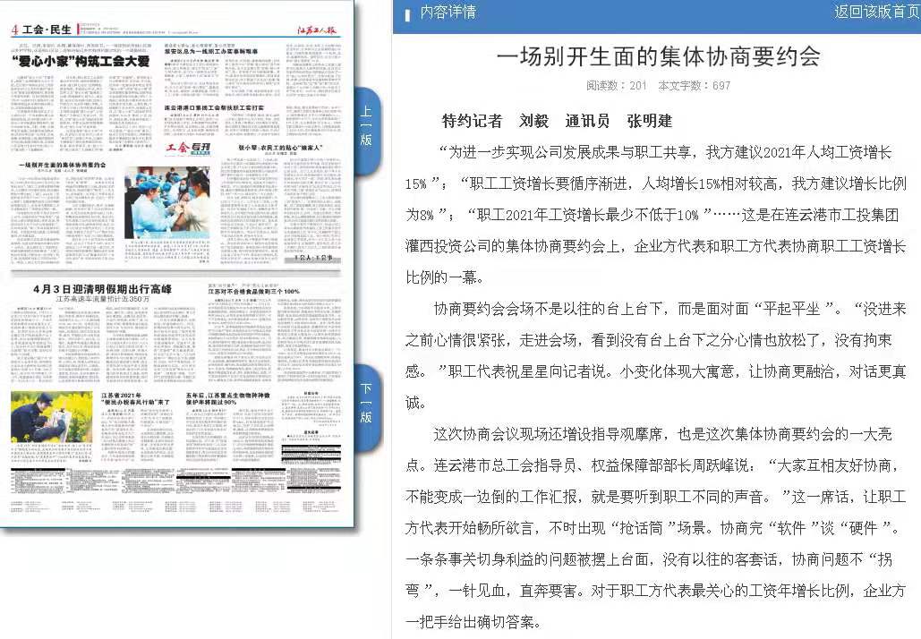 “為進(jìn)一步實現(xiàn)公司發(fā)展成果與職工共享,我方建議2021年人均工資增長15%”;“職工工資增長要循序漸進(jìn),人均增長15%相對較高,我方建議增長比例為8%”;“職工2021年工資增長最少不低于10%”……這是在連云港市工投集團(tuán)灌西投資公司的集體協(xié)商要約會上,企業(yè)方代表和職工方代表協(xié)商職工工資增長比例的一幕。