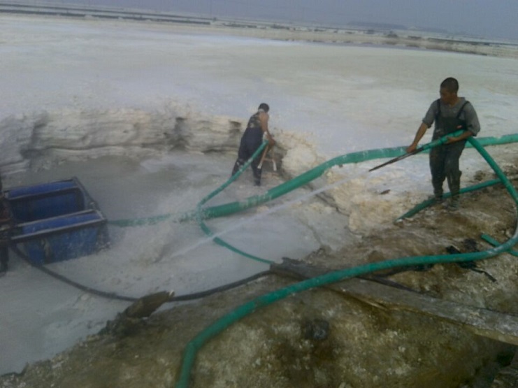 近日來,連續高溫酷暑天氣對日曬制鹽員工提出了生理挑戰,新河制鹽廣大員工直面高溫,不畏酷暑,積極做好除硫工作,保證原鹽質量。圖為除硫現場操作手緊握高壓水槍,對硫酸鈣沉淀區進行沖刷。(新河制鹽 邱利民)