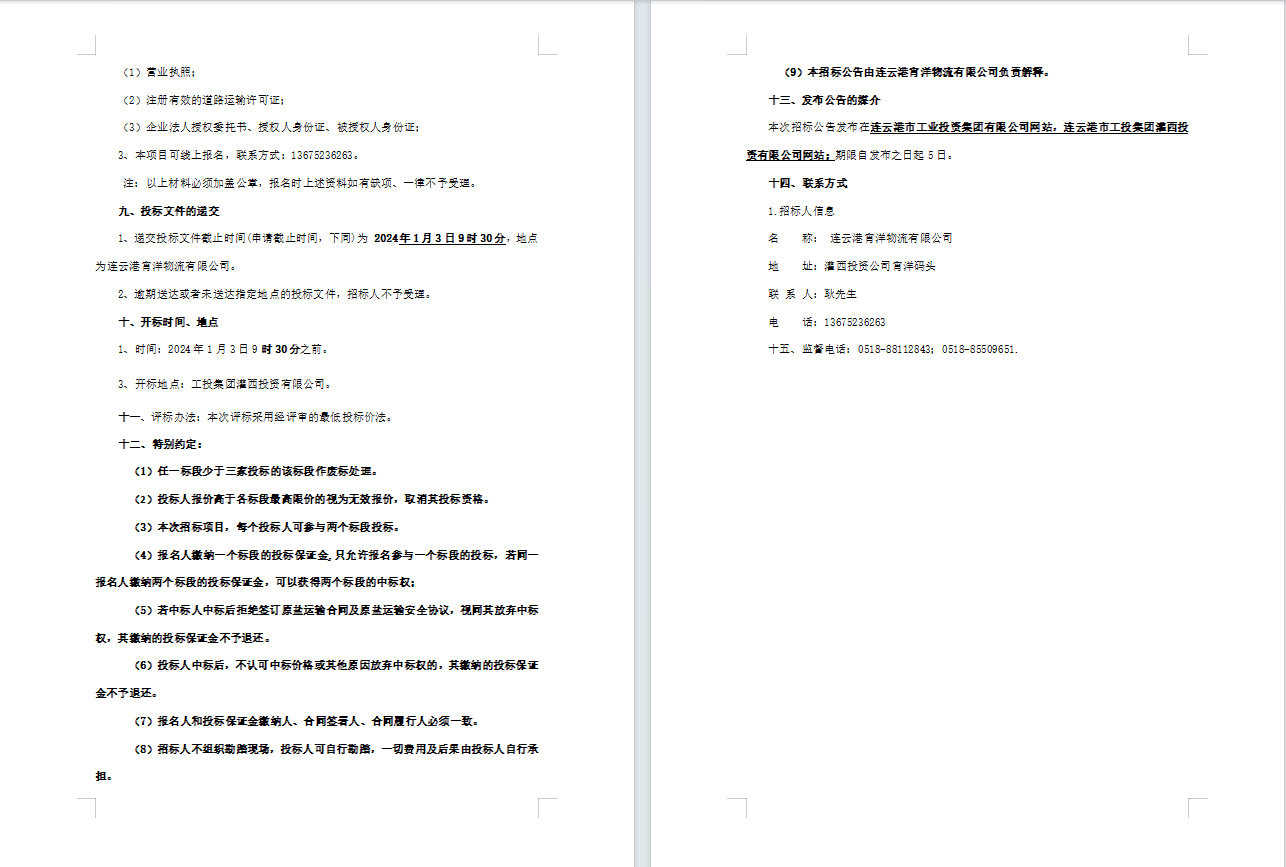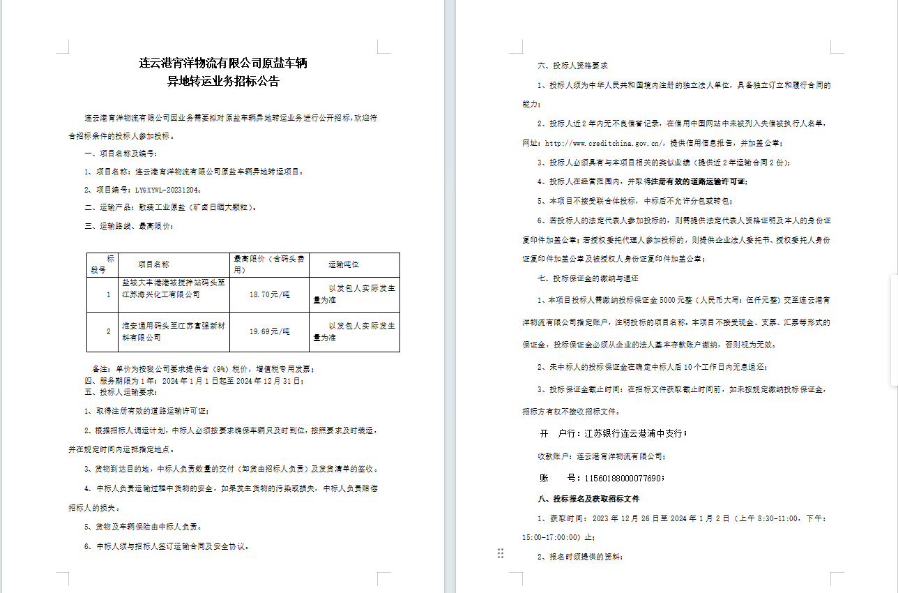 連云港宵洋物流有限公司原鹽車輛異地轉(zhuǎn)運業(yè)務(wù)招標公告