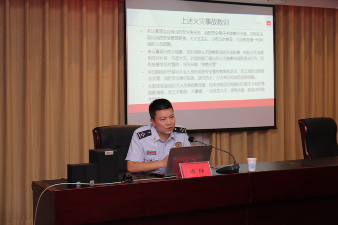 為規(guī)范消防安全管理,提高公司干部職工消防安全意識(shí)和火災(zāi)應(yīng)急處置能力,7月7日,我公司邀請(qǐng)連云區(qū)消防隊(duì)副隊(duì)長唐燁,在三樓會(huì)議室開展消防安全知識(shí)培訓(xùn)。公司董事長、黨委書記、總經(jīng)理朱桂玉,黨委副書記、工會(huì)主席曹開明,副總經(jīng)理何啟明,總經(jīng)理助理李忠祥,各單位、車間、部室人員參加了培訓(xùn)。