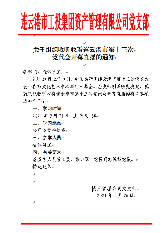關(guān)于組織收聽(tīng)收看連云港市第十三次黨代會(huì)開(kāi)幕直播的通知