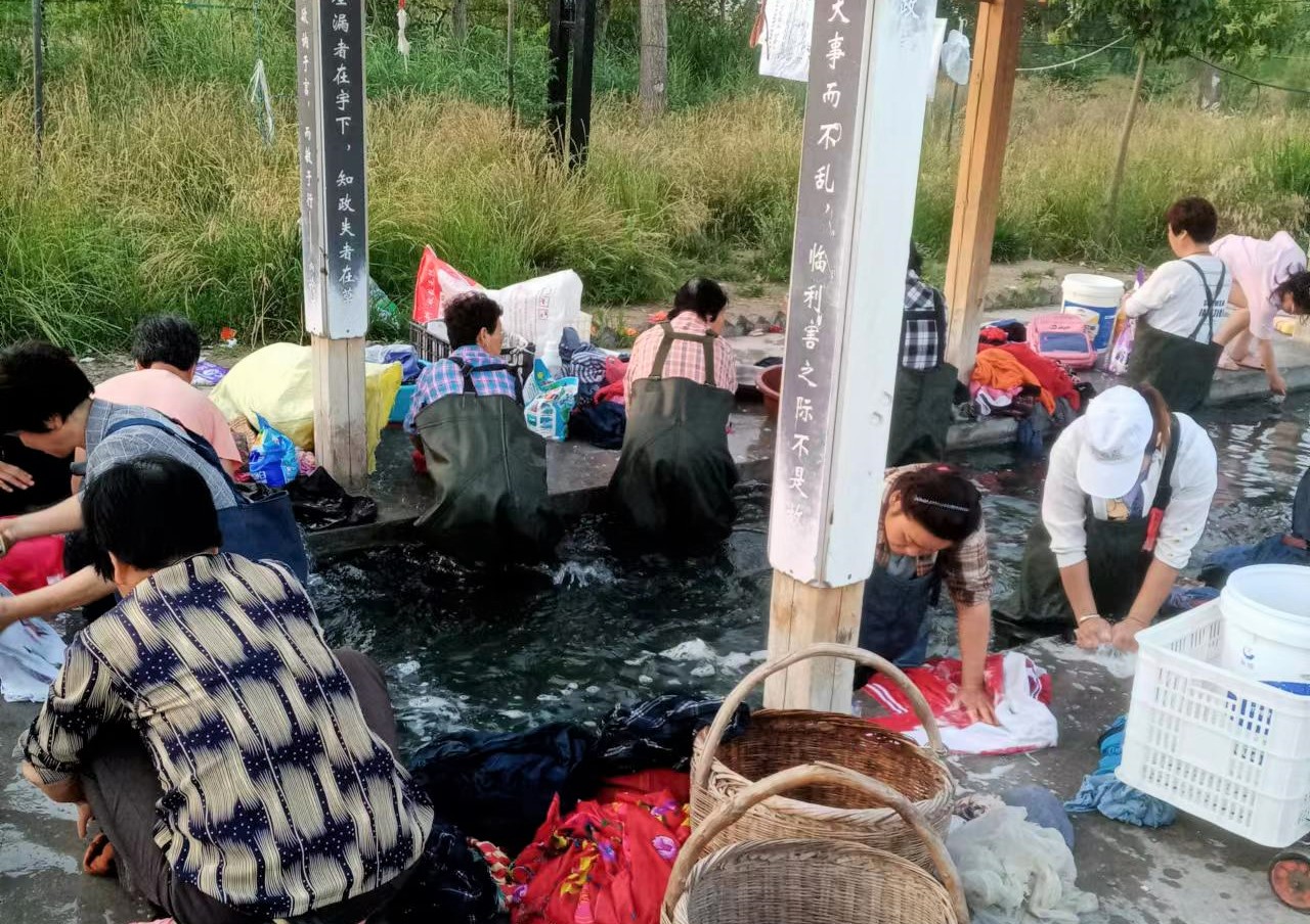 想到這些,我很好奇的查了查這個地方,原來洽川之前的洗衣溝渠被新規劃占用,他們重新選址建設了這個關雎洗衣文化長廊。通過打一眼溫水自噴井,用青石堆砌一條寬3米、長30余米的青石洗衣渠道,并且搭設了木結構的文化長廊,來保護當地特有的洗衣文化。